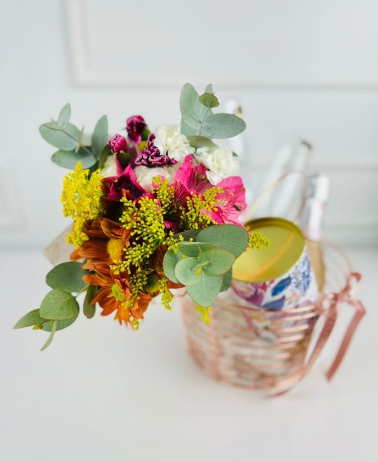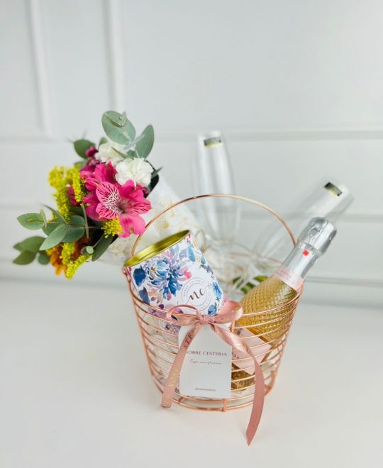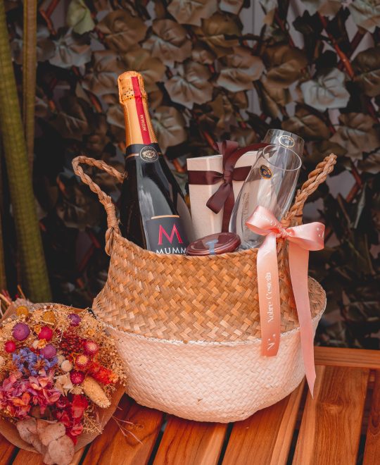 01 espumante brut ou rose MUMM – 750ml 01 creme de brie POMERODE 100g 01 mix de nuts 01 azeitona recheada LA PASTINA 235g 01 caixa personalizada com chocolates gourmet gifts: 01 cesto de palha conceito DECOR 02 taças de cristal para espumante 01 arranjo flores naturais desidratadas