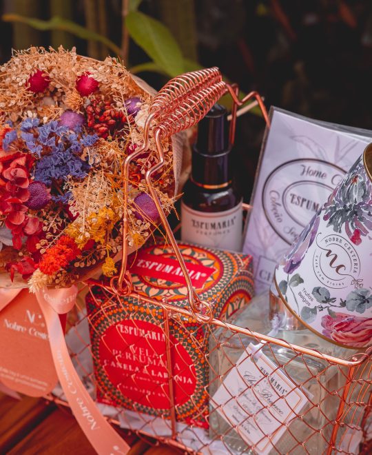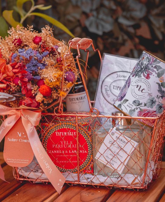 01 difusor ESPUMARIA grande (vidro) 01 vela perfumada ESPUMARIA grande (vidro) 01 home fragrance spray ESPUMARIA 02 sachês aromatizadores ESPUMARIA 01 lata de chocolate gourmet gifts: 01 cesto aramado picnic rose 01 arranjo flores naturais desidratadas ***entrega cortesia Peruíbe***