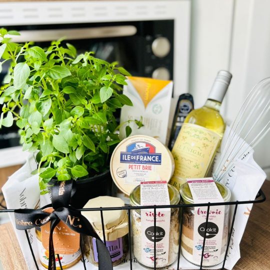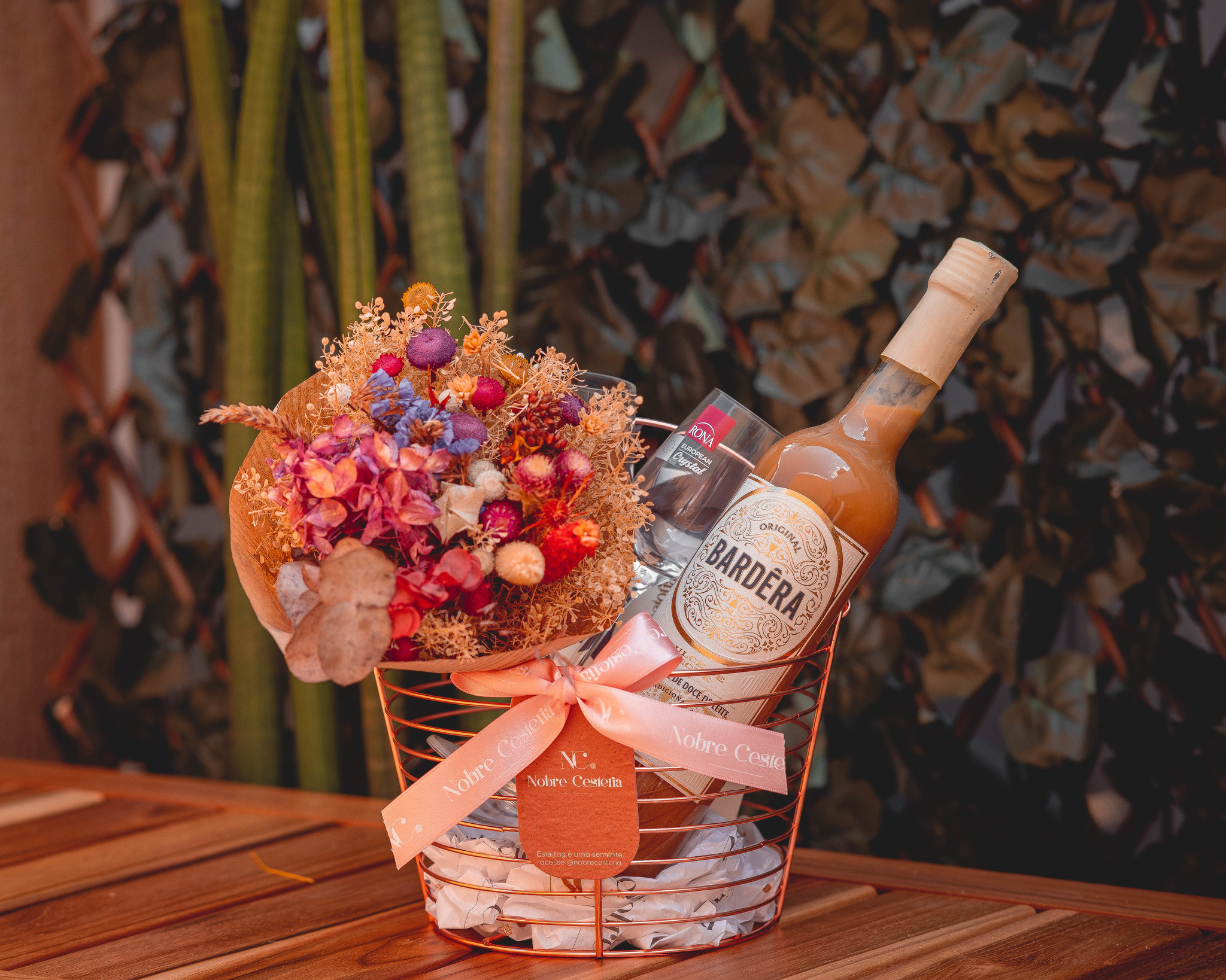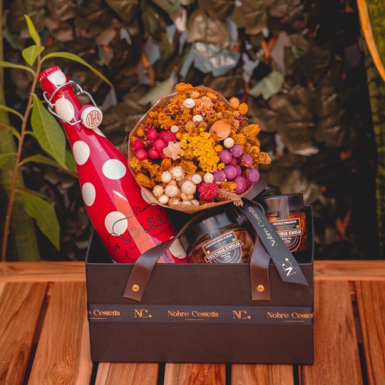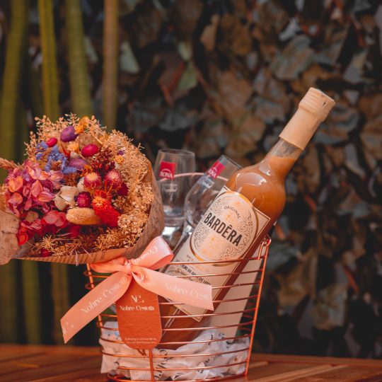 01 vinho especial – 750ml (consultar carta) 01 creme de brie POMERODE 90g 01 geleia artesanal DONA CHICA 240g 01 torrada super fina VERMONT 44g 01 grissini sabor parmesão CASA FORTUNATO 90g 01 mix de nuts gifts: 01 cesto de palha conceito DECOR 01 arranjo flores naturais desidratadas 02 taças de cristal para vinho